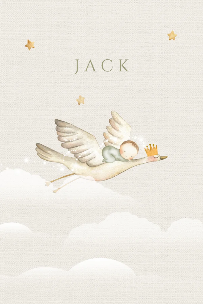 Een lief geboortekaartje voor een jongen. Het kaartje heeft een beige basis met dromerige wolkjes. In het midden van het kaartje zie je een illustratie van een ooievaar met baby. Het ontwerp is naar wens aan te passen in onze online editor.