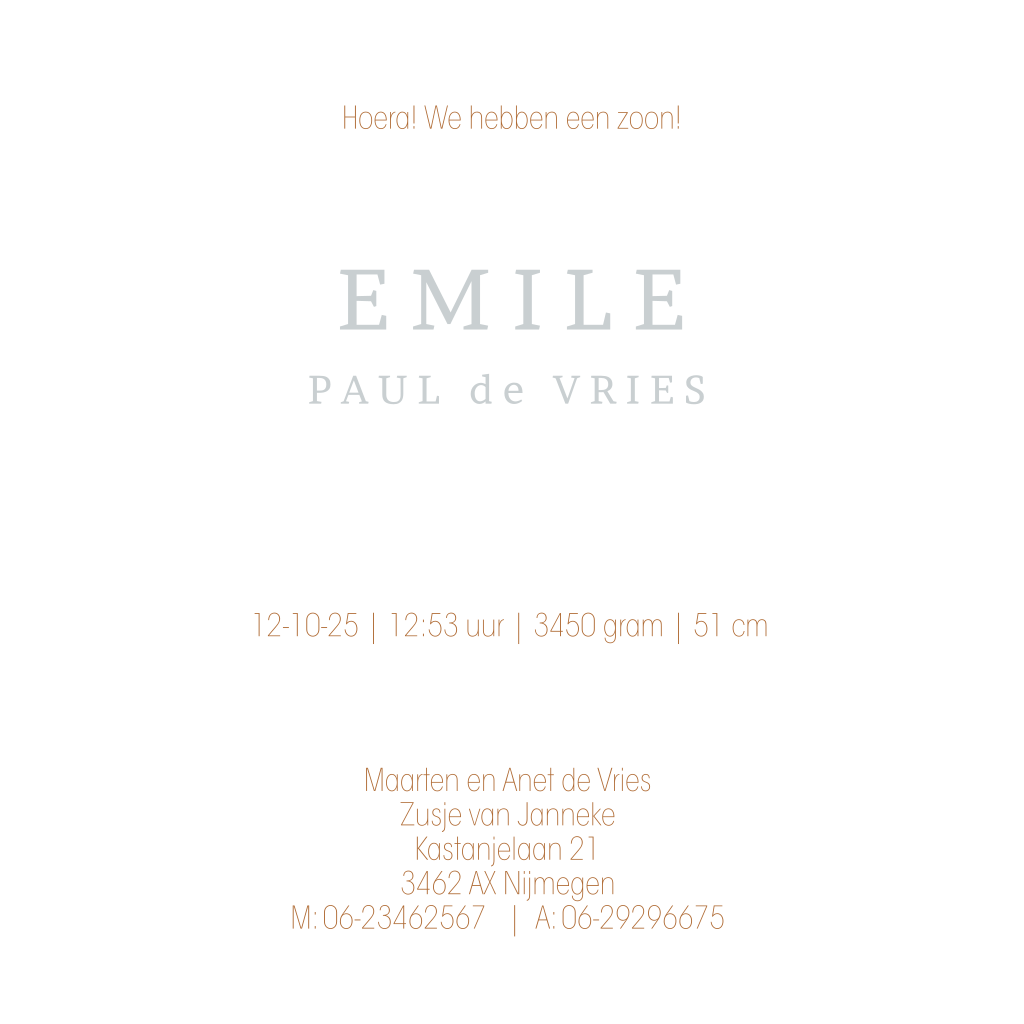 Een krans van takjes met lieve konijnen en vlinders: wat tof! Leuk voor de geboorte-aankondiging van een zoontje. Teksten en lettertypes zijn naar wens aan te passen in onze online editor.