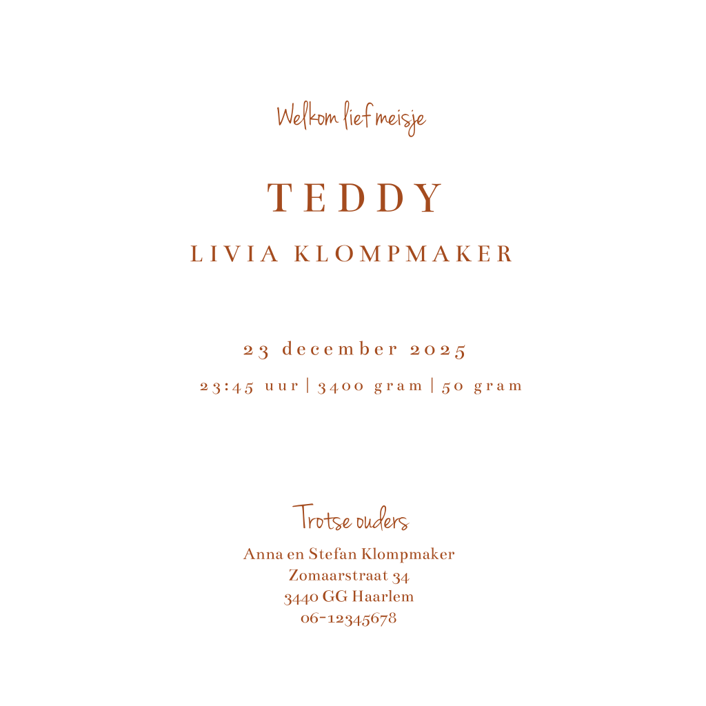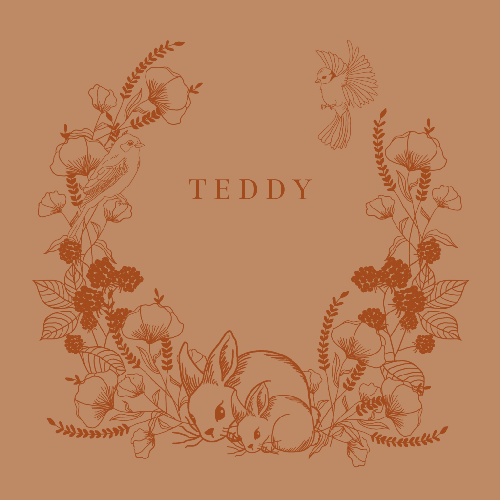 Lief, getekend geboortekaartje met een lijntekening van planten en konijntjes. Leuk voor zowel een jongen als een meisje. Kleuren en lettertypes kun je naar wens aanpassen in de online editor. Maak hem zelf af!