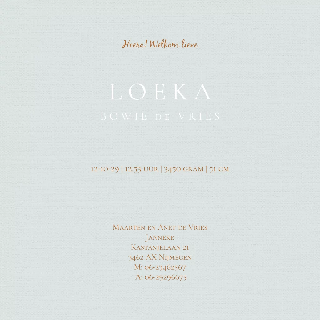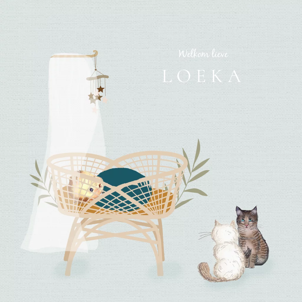 Dit is een mooi geboortekaartje voor je zoon. Op het kaartje zie je een kindje in een wieg en de tekening van twee katten. Het kaartje kan helemaal naar wens aangepast worden in onze online editor.
