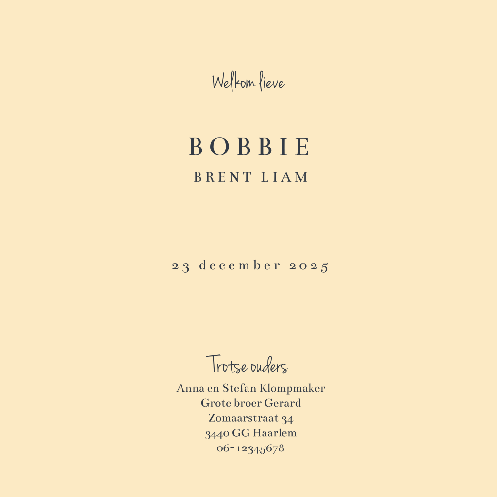 Trendy geboortekaartje voor je zoontje of dochtertje met zwarte stipjes en verfstreep op een crème achtergrond.