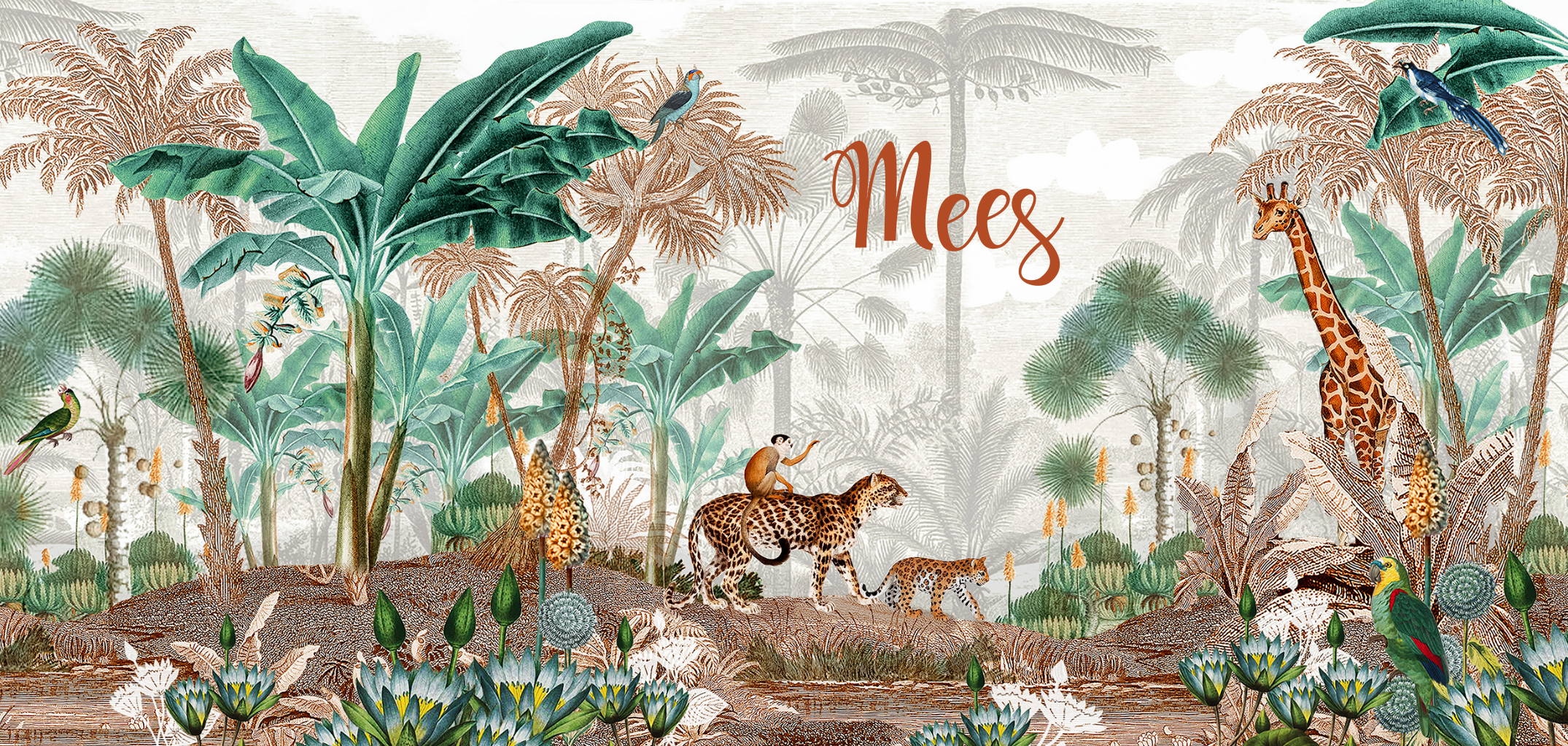 Een trendy geboortekaartje voor jullie kleintje. Op het kaartje zie je prachtige illustraties van verschillende jungle dieren, zoals een panter, giraffe en tijger. Het kaartje heeft groene en bruine kleuren.