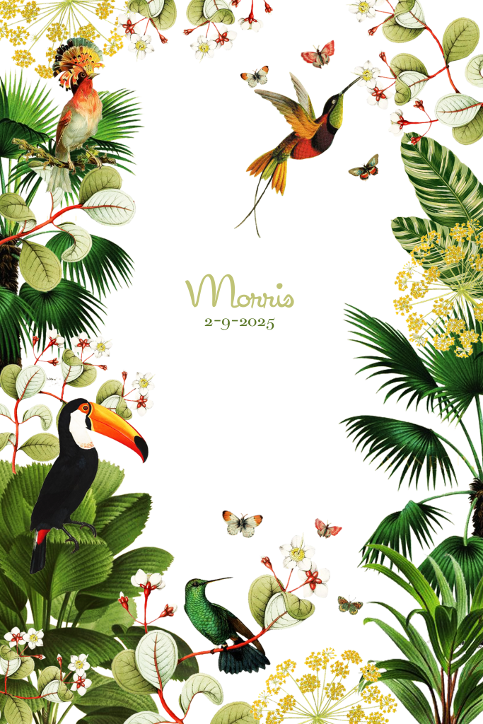 Wat een prachtige, tropische vogels heeft dit romantische geboortekaartje! Dit jungle-babykaartje is versierd met allerlei planten en een toekan, kolibri, vlinders en distels. Helemaal van nu!