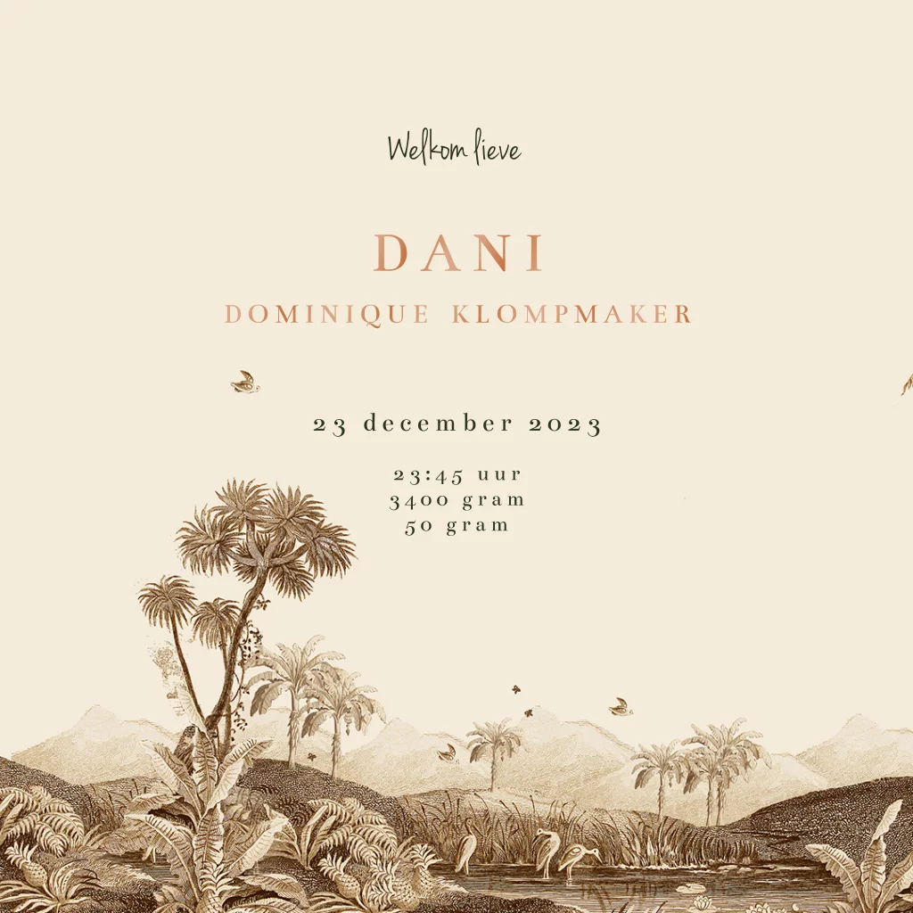Een ton sur ton bruin geboortekaartje voor jouw kindje. Het kaartje heeft een prachtige illustratie van giraffen. De naam wordt gedrukt in hoogglans. Pas het kaartje naar wens aan in onze online editor.