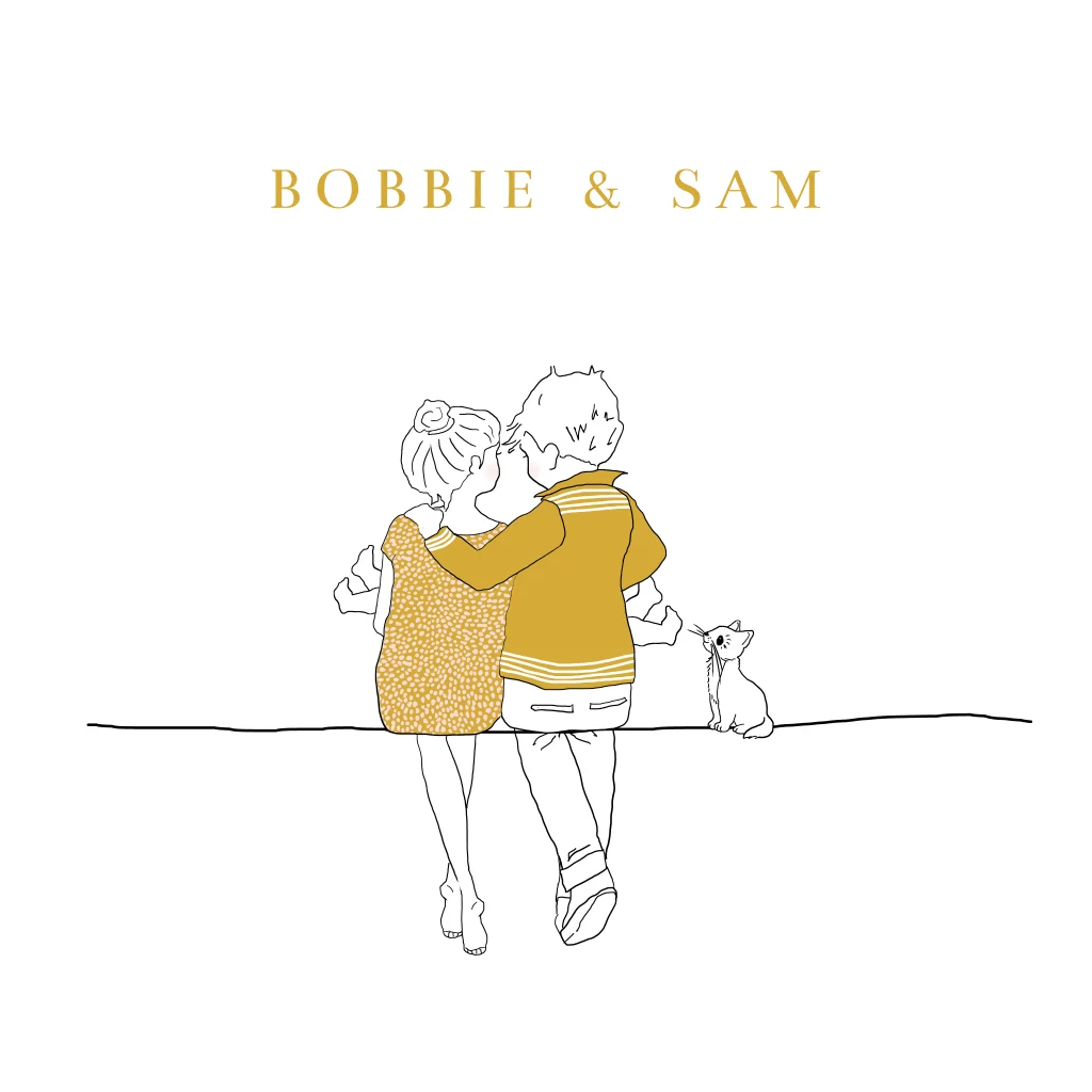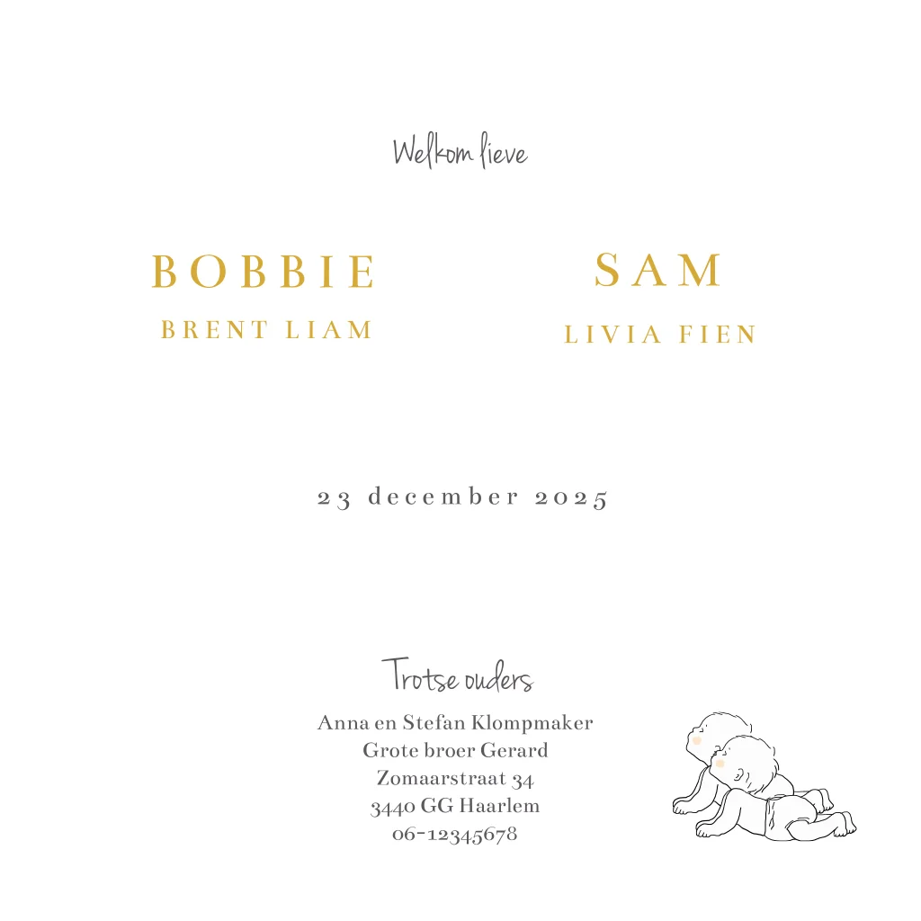 Lief, getekend geboortekaartje voor een tweeling met een tekening van papa en mama en de kat. Kleuren en lettertypes zijn naar wens aan te passen in onze online editor! Maak jij hem af?