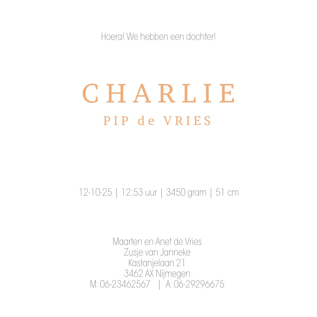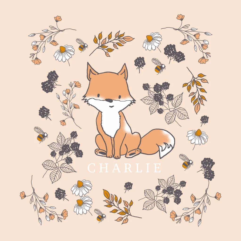 Hoera, een meisje! Stuur vrienden en familie dit vrolijke geboortekaartje met getekend vosje, planten en madeliefjes. Kleuren en lettertypes zijn naar wens aan te passen in de online editor.