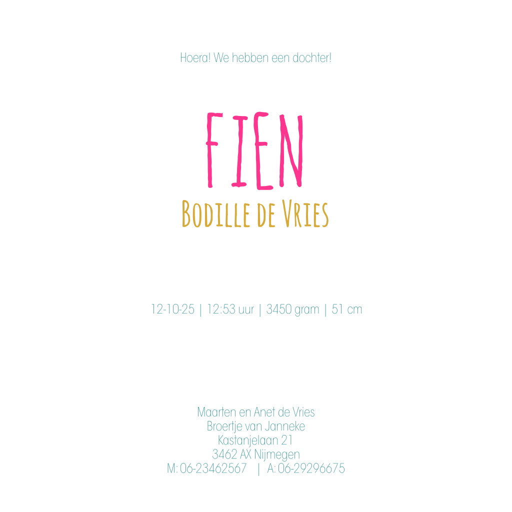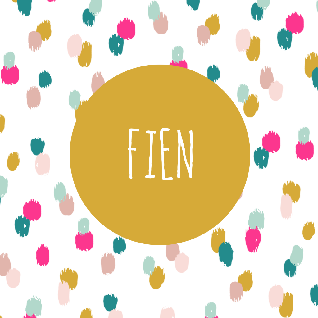 Allemaal verfstippen in verschillende kleuren op je geboortekaartje: wat vrolijk! Aan de binnenkant is ruimte voor je eigen tekst. Hoe heet jouw dochtertje? Zet dit in het lettertype dat jij wilt in de hippe okergele cirkel!