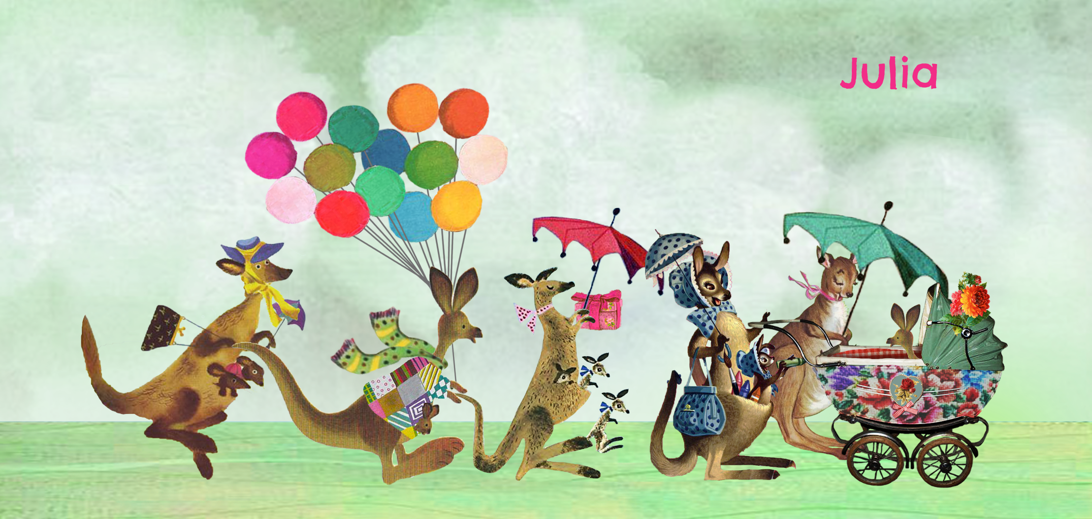 Familie kangoeroe loopt in een vrolijke stoet, want er is een kleintje geboren! Dit vrolijke, panorama babykaartje is ontworpen door Studio POPPY en leuk voor een meisje.