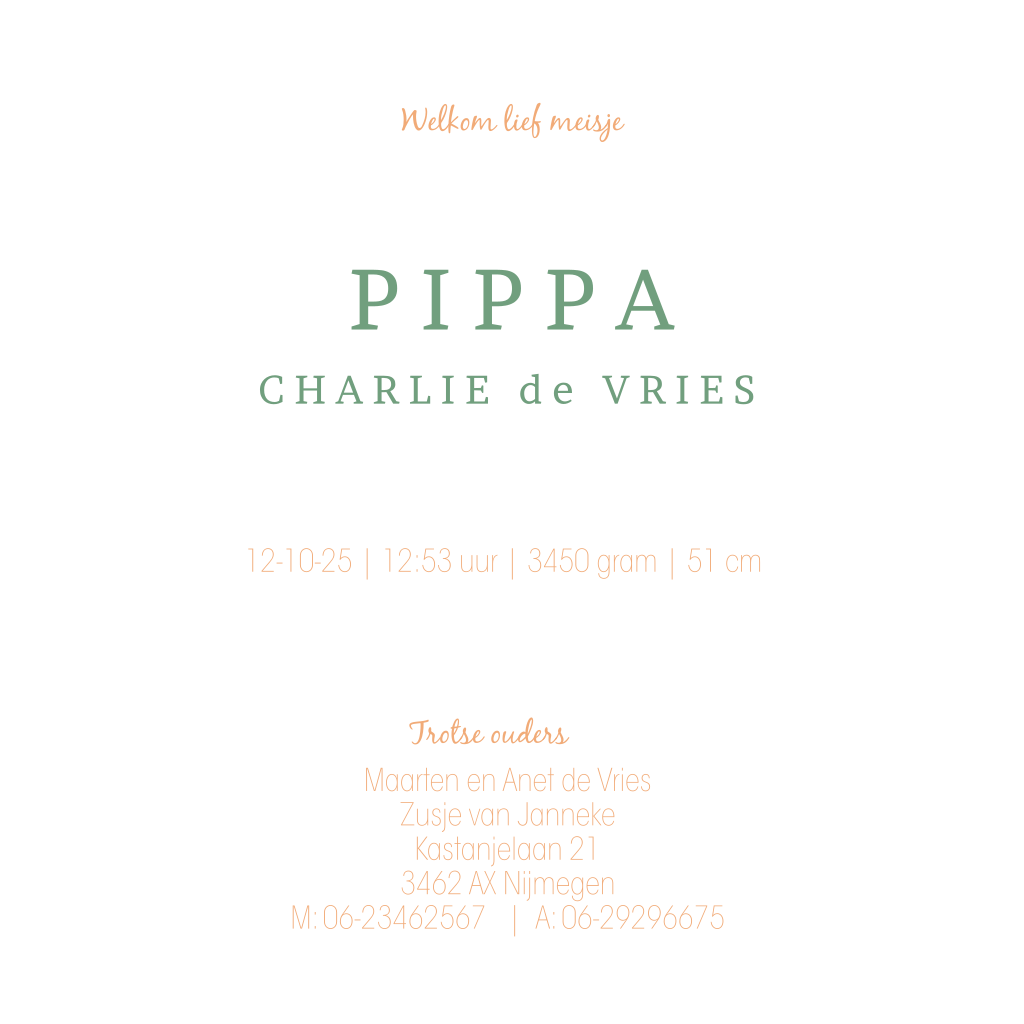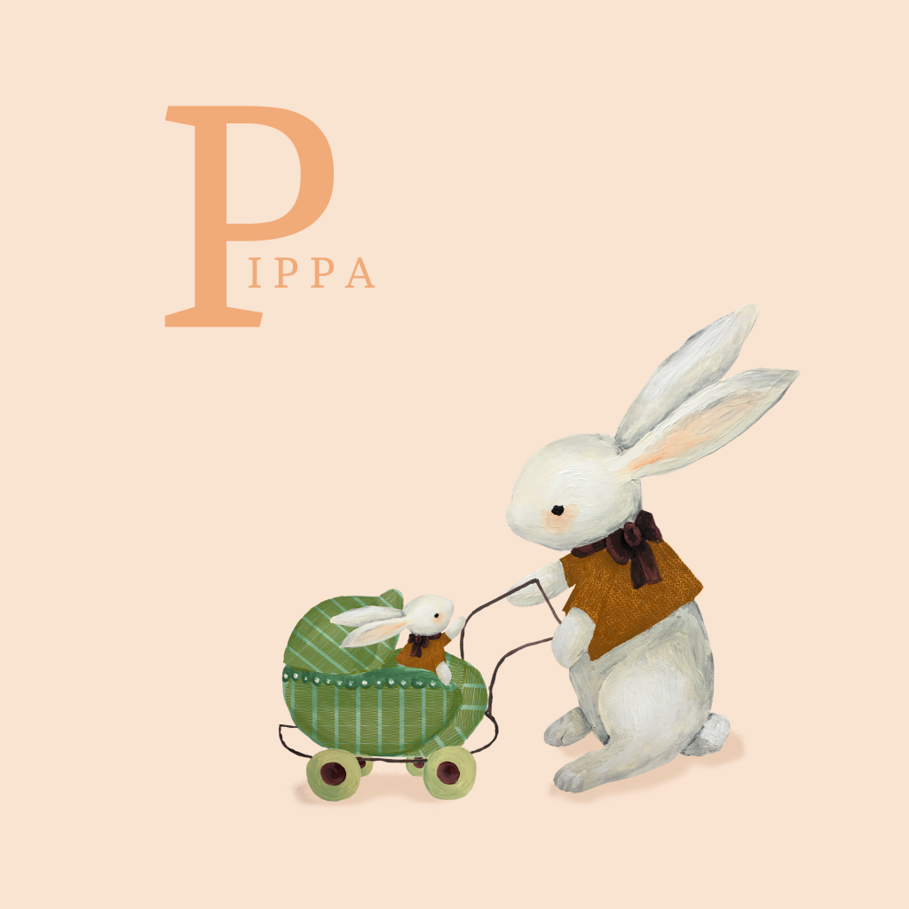 Lief geboortekaartje met hand geschilderde illustratie van mamakonijn met haar kleintje in een kinderwagen. Leuk voor een dochter! Een ontwerp van Studio POPPY.