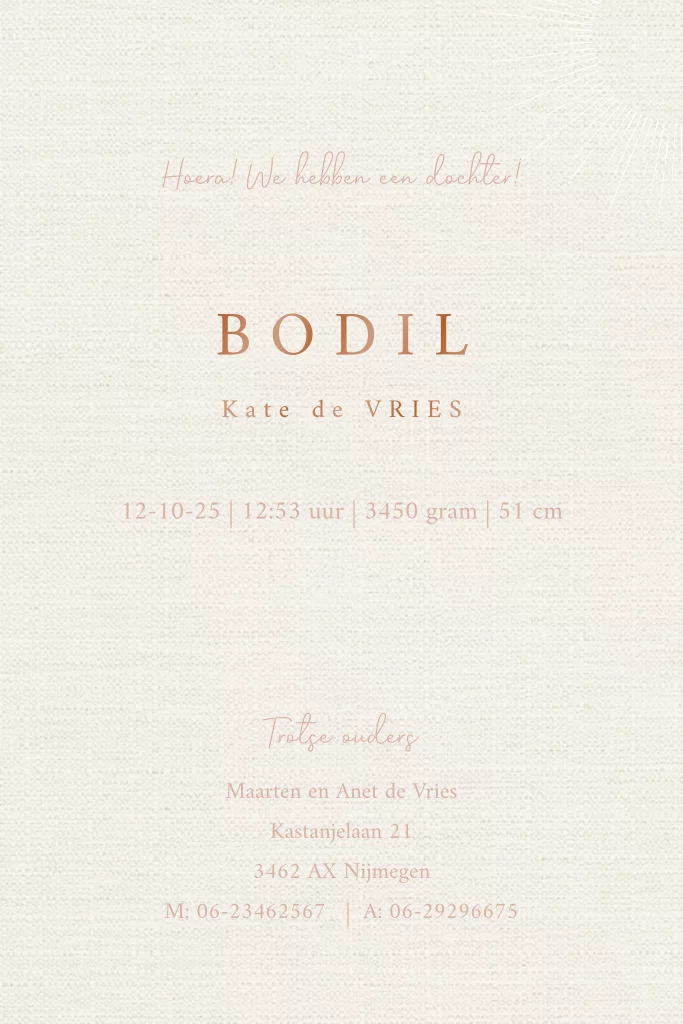 Kondig de geboorte van je dochter aan met dit mooie kaartje. Het kaartje heeft een bohemian thema. De combinatie van de lichte achtergrond met hoogglans elementen is prachtig. Ook zo'n fan van dit kaartje? Bestel een proefdruk en bewonder dit kaartje in het echt.