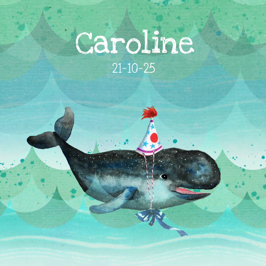 Een walvis met een feesthoedje op: wat leuk! Tof aan dit geboortekaartje is de met de hand geschilderde walvis op een achtergrond van golven in zeegroen en aquablauw. Een vrolijk en hip kaartje voor een jongen! Tip: Combineer de kaart met een envelop in petrol of mint.