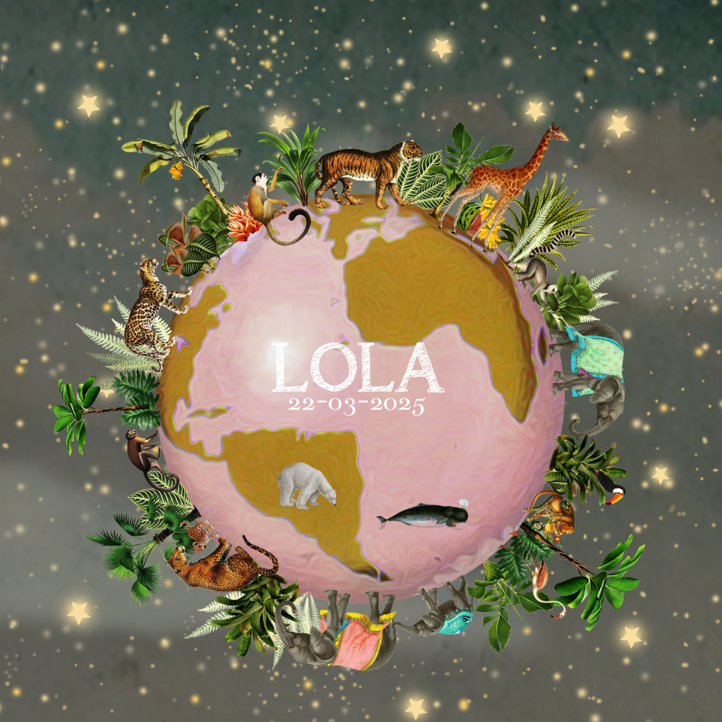 Een origineel geboortekaartje met een wereldbol met botanische elementen en een sterrenhemel. Om de wereldbol heen lopen allemaal dieren. Leuk voor een meisje! Maak hem zelf compleet met eigen teksten en een bijpassende envelop.
