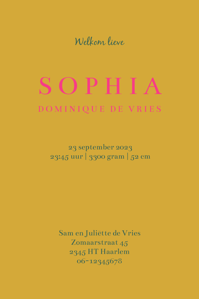 Een geboortekaartje met felle kleuren in dip dye effect. De kleuren van dit kaartje zijn mosterd geel met knalroze die langzaam in elkaar overlopen doormiddel van een dip dye effect. De naam van jullie dochtertje staat ook in het roze geschreven met daaronder een schattig bloemetje.