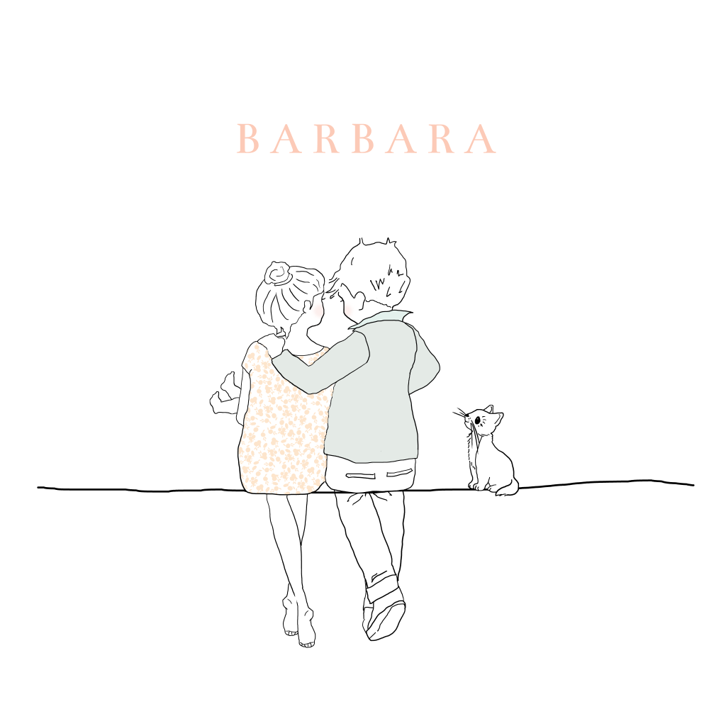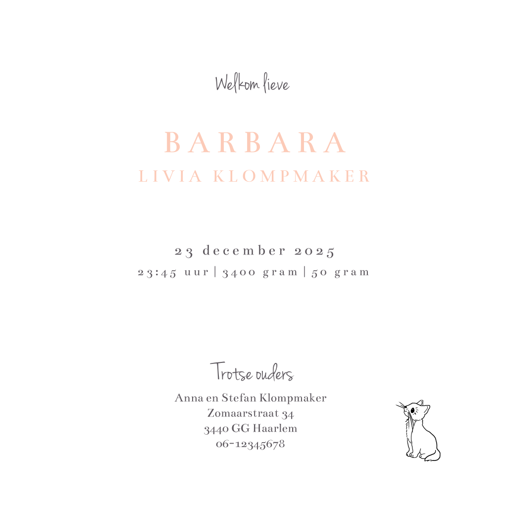Een vierkant geboortekaartje met een tekening van papa, mama en een poesje. De naam van jullie dochter staat boven en kun je kleuren in jullie favoriete kleur. Maak hem zelf af!