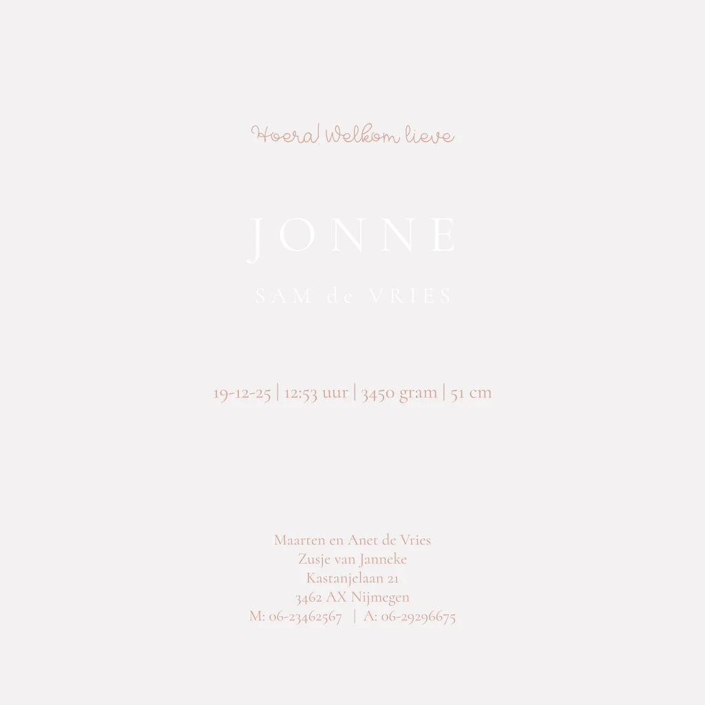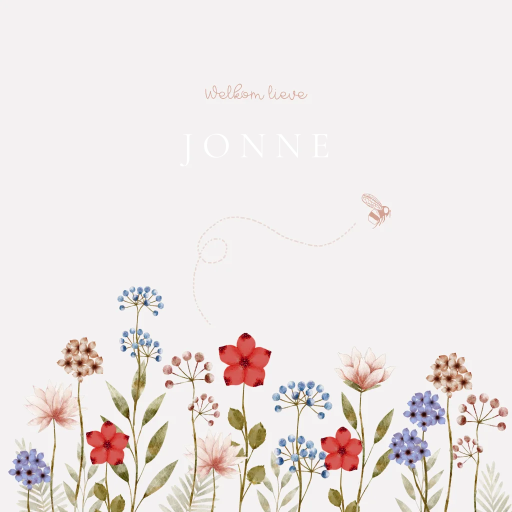 Een lief en vrolijk geboortekaartje voor jouw meisje. Het kaartje heeft prachtige illustraties van kleurrijke bloemen. De naam wordt gedrukt in goudfolie. Pas het ontwerp naar wens aan in onze online editor.