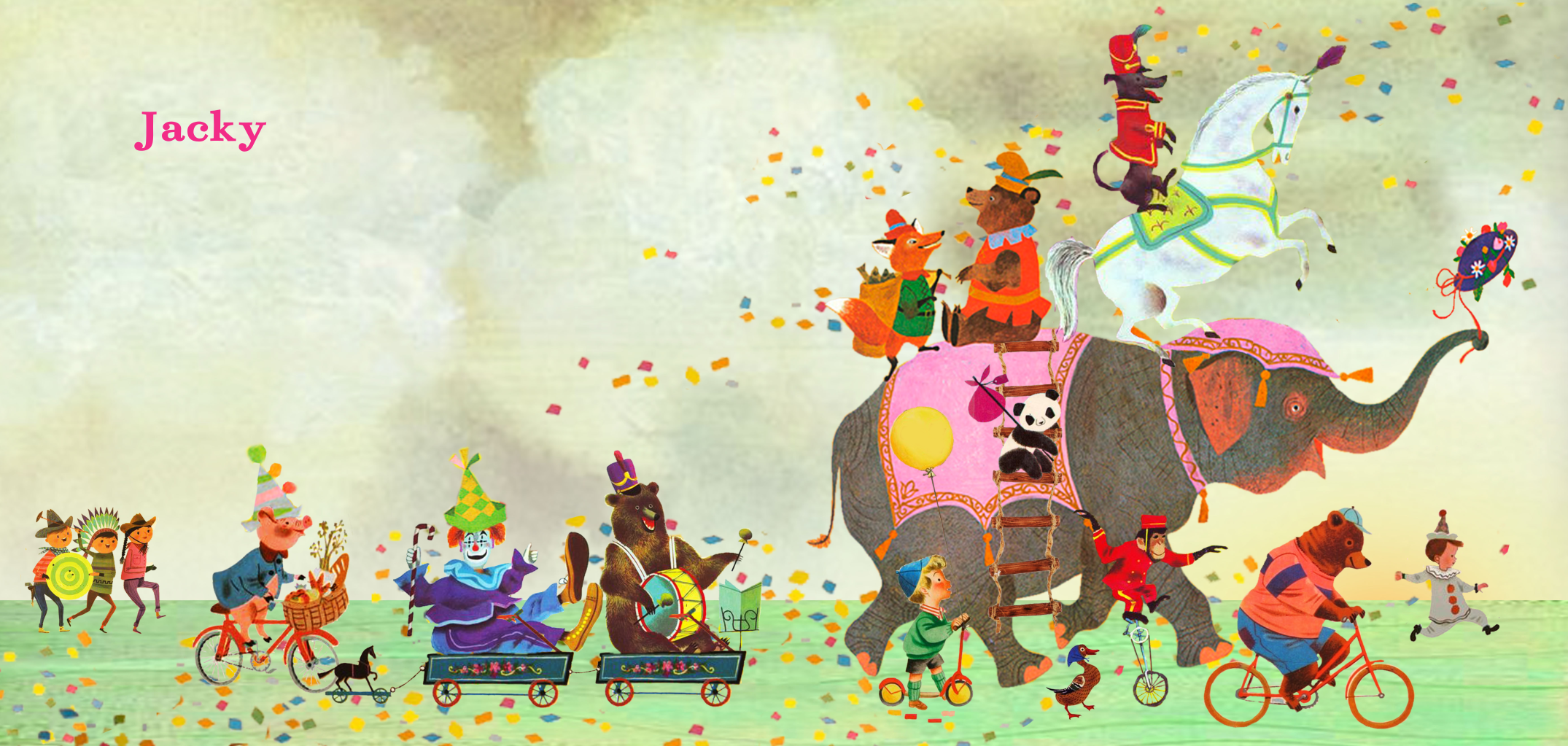 Kijk wat een vrolijke stoet van dieren, clowns en getekende poppetjes! De confetti en alle feestattributen maken dit een feestelijk geboortekaartje. Ontworpen door Studio Poppy.