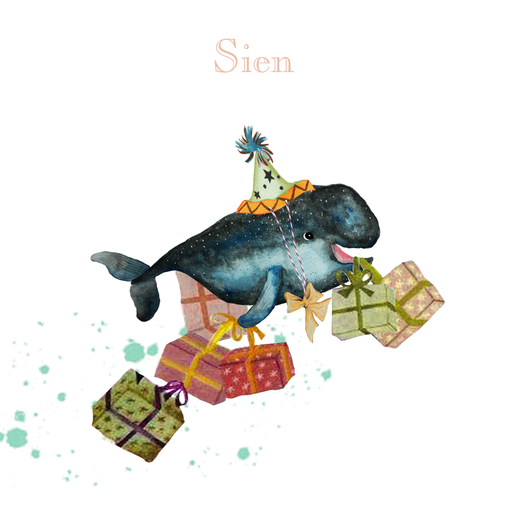 Origineel vintage geboortekaartje voor om de geboorte van je dochtertje aan te kondigen met retro walvis met kadootjes en licht blauwe waterverf spetters. Verander de teksten en kies je eigen lettertypes en maak zo je kaart uniek!