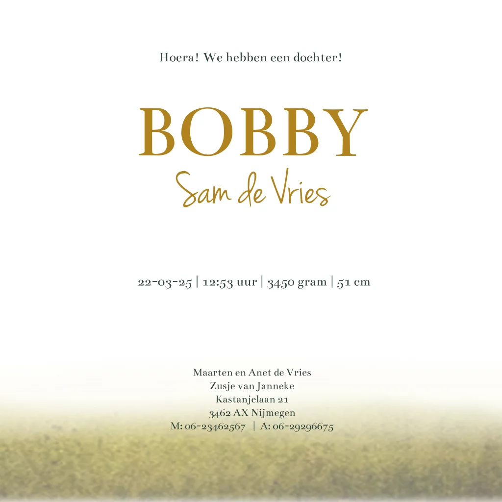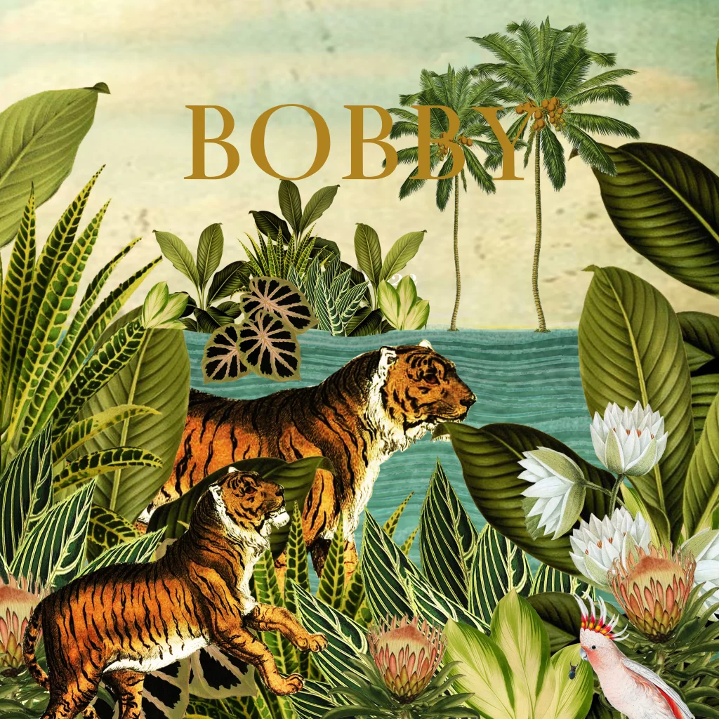 Prachtig, illustratief geboortekaartje voor een meisje. Met tijgers die langs de waterrand lopen tussen de tropische, groene planten. Maak hem zelf compleet met eigen teksten en een bijpassende envelop in bijvoorbeeld donkergroen of goudlook.