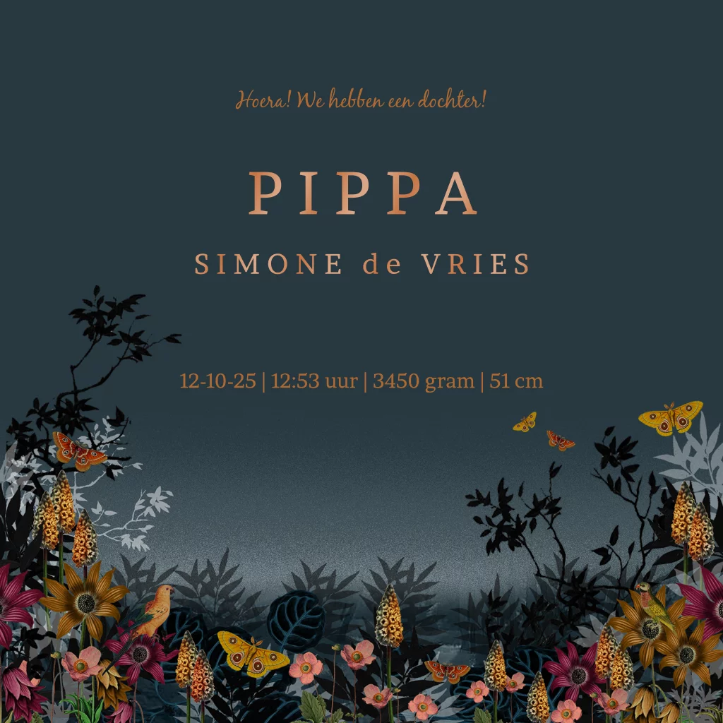 Wat een gaaf geboortekaartje voor jouw dochter. Dit kaartje heeft een vierkante vorm en prachtige illustraties van zebra's. Het kaartje heeft een warme dromerige uitstraling en prachtige illustraties van bloemen en takken.