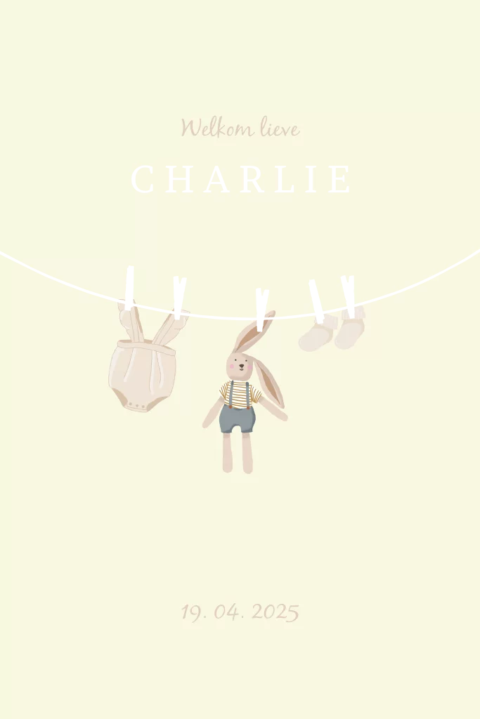 Wat een schattig geboortekaartje voor jou kindje! Het kaartje heeft een staand formaat en een gele kleur. Je ziet een waslijn vol met kleertjes en een knuffel. De naam en waslijn zijn gedrukt in goudfolie. Pas het kaartje naar wens aan in onze online editor.
