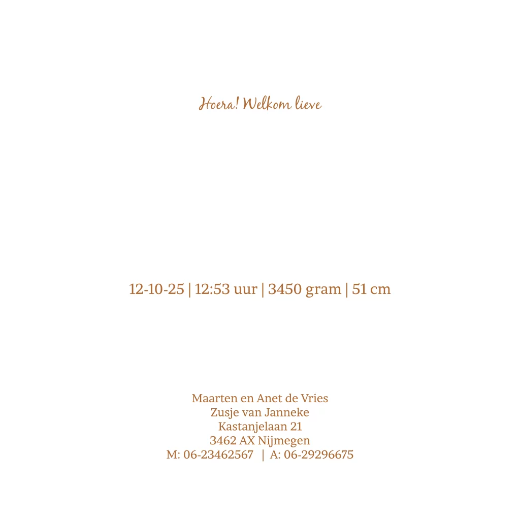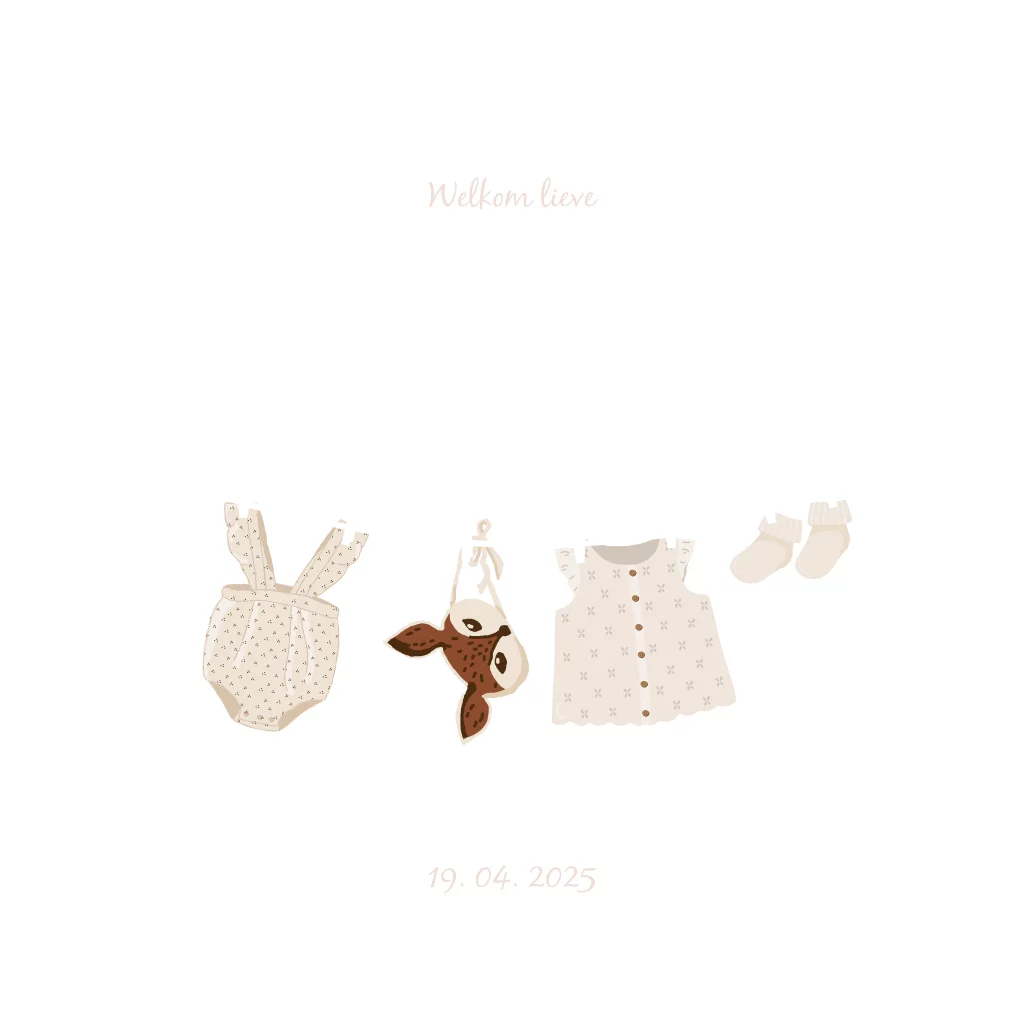 Wat een schattig vierkant geboortekaartje voor een meisje. Het kaartje heeft een witte achtergrond met verschillende goudfolie details. Aan de waslijn hangen verschillende kleertjes voor jouw kindje. Pas het kaartje naar wens aan in onze online editor.