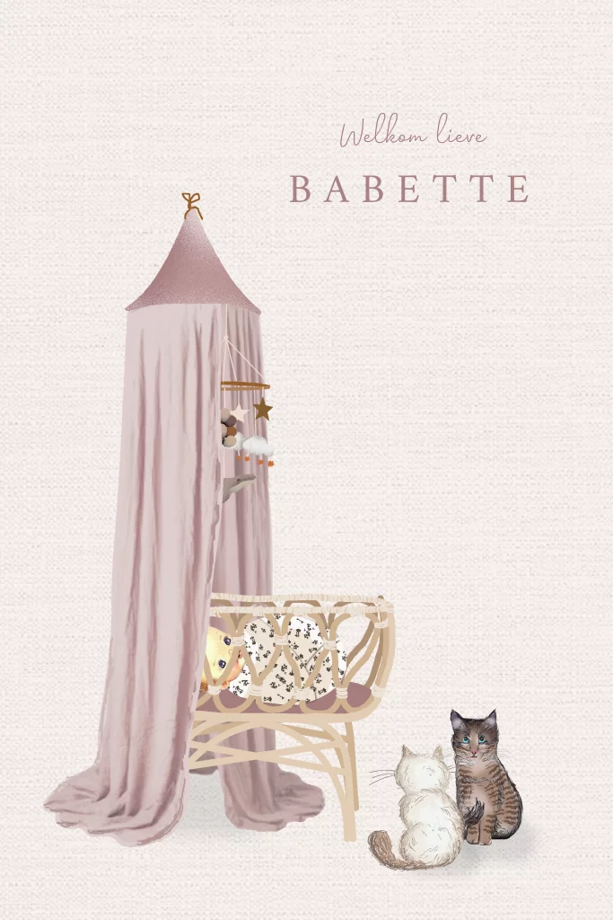 Getekend geboortekaartje met wieg en katten voor een meisje