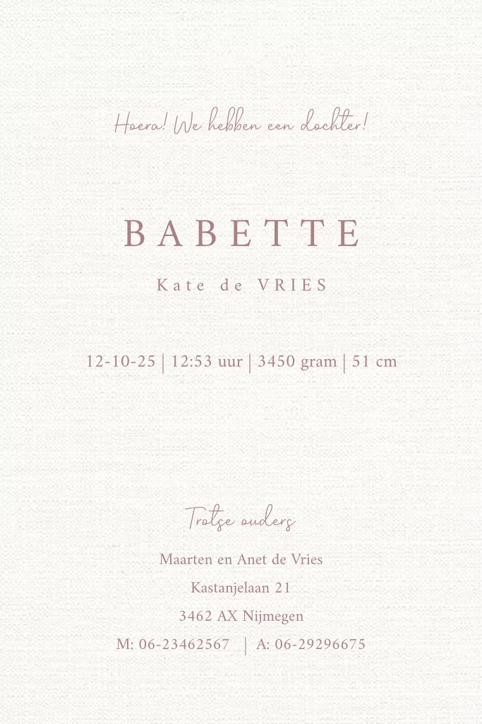 Dit is een lieve kaart voor de geboorte van je dochter. Op de kaart zie je de illustratie van een wiegje met twee katjes. Het kaartje kan helemaal naar wens aangepast worden in onze online editor.