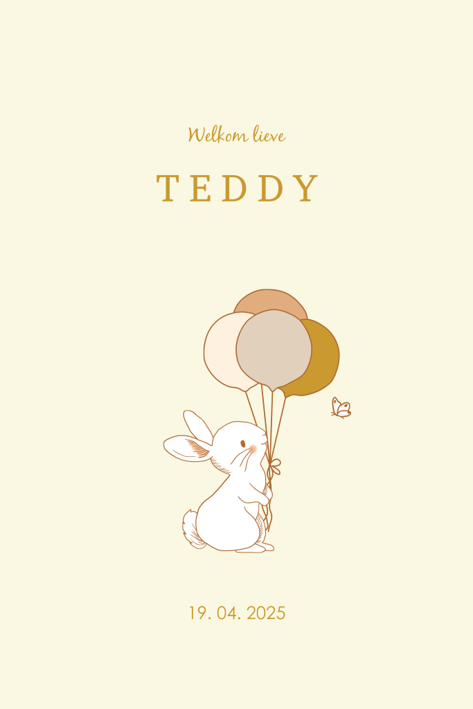 Wat een vrolijk geboortekaartje! Het gele geboortekaartje voor jouw kindje heeft een schattige illustratie van konijntje met ballonnen in zijn hand. Daarbij zie je ook een klein vlindertje. Pas het staande geboortekaartje naar wens aan in onze online editor.