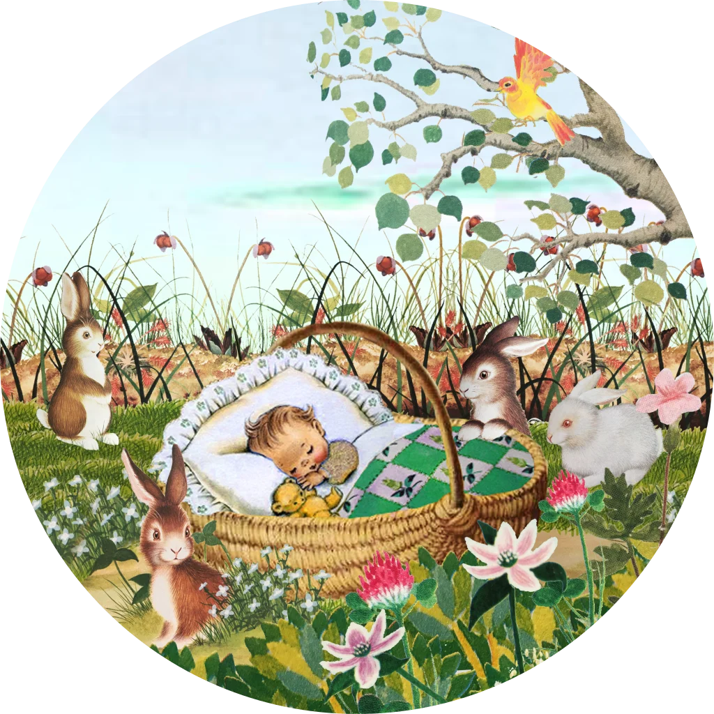 Maak het versturen van de geboortekaartjes extra feestelijk met deze sluitsticker! In een kleurrijk landschap ligt een kindje in de wieg te slapen. Twee nieuwsgierige konijntjes komen kijken.