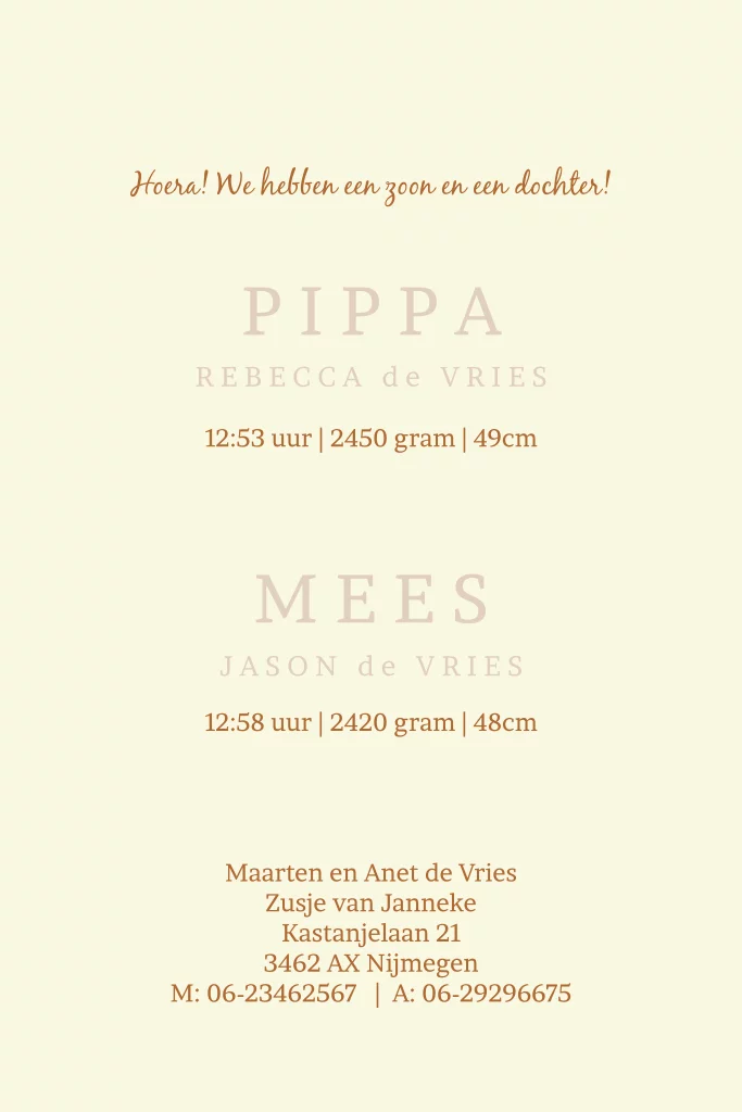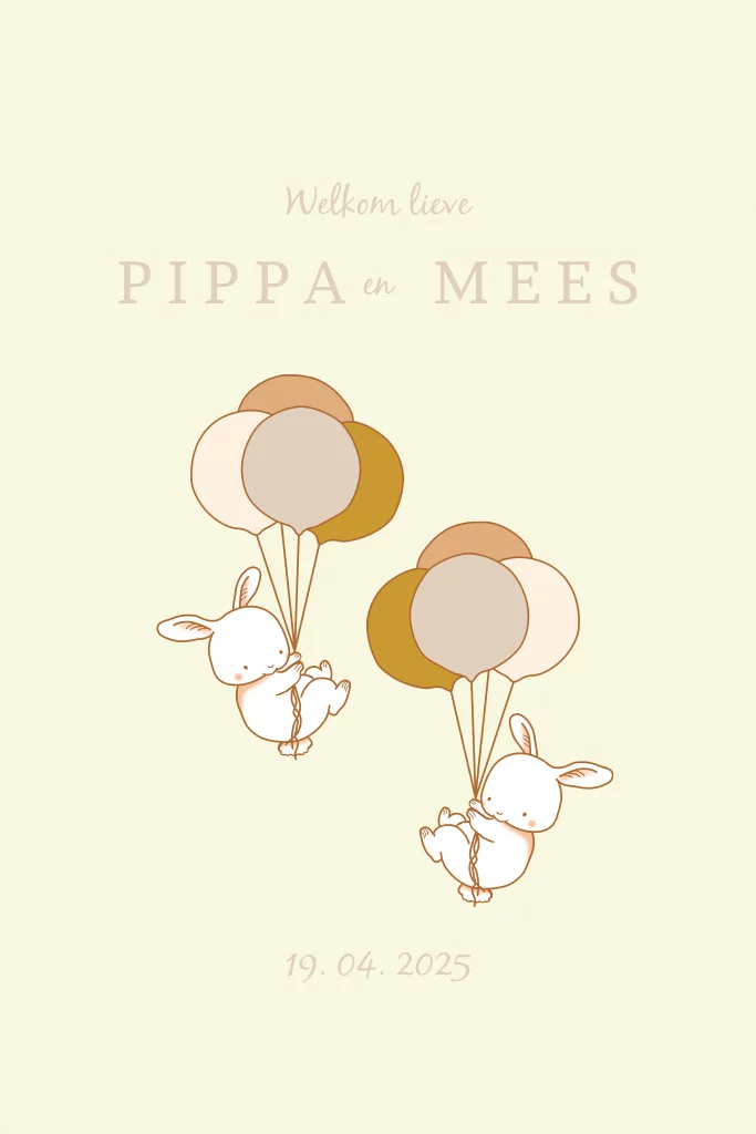 Een vrolijk geboortekaartje voor jouw tweeling. Het kaartje heeft een gele achtergrond met daarop een lieve illustratie van twee konijntjes hangend aan ballonnetjes.
