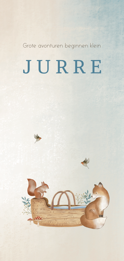 Dit is een prachtig herfstkaartje voor jullie pasgeboren zoon. Op het kaartje staat de tekening van een vosje, eekhoorn en twee vogeltjes bij een mozesmand. Pas het kaartje naar wens aan in onze online editor en bestel snel een proefdruk om dit kaartje in het echt te zien!