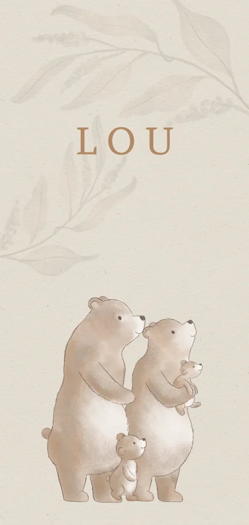 Een lief geboortekaartje voor jullie tweede kindje. Op het kaartje zie je een beren familie, bestaande uit twee ouders en twee kindjes. Het ontwerp heeft verder mooie watercolour takjes en bestaat verder uit verschillende bruine kleuren.
