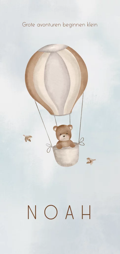 Een schattig geboortekaartje voor jouw zoontje. Het kaartje heeft een lieve lichtblauwe watercolour achtergrond. Daarop is een illustratie te zien van een beertje in een luchtballon die wordt vergezeld door twee vogeltjes. Pas het kaartje in onze online editor aan en bestel gemakkelijk een proefdruk.