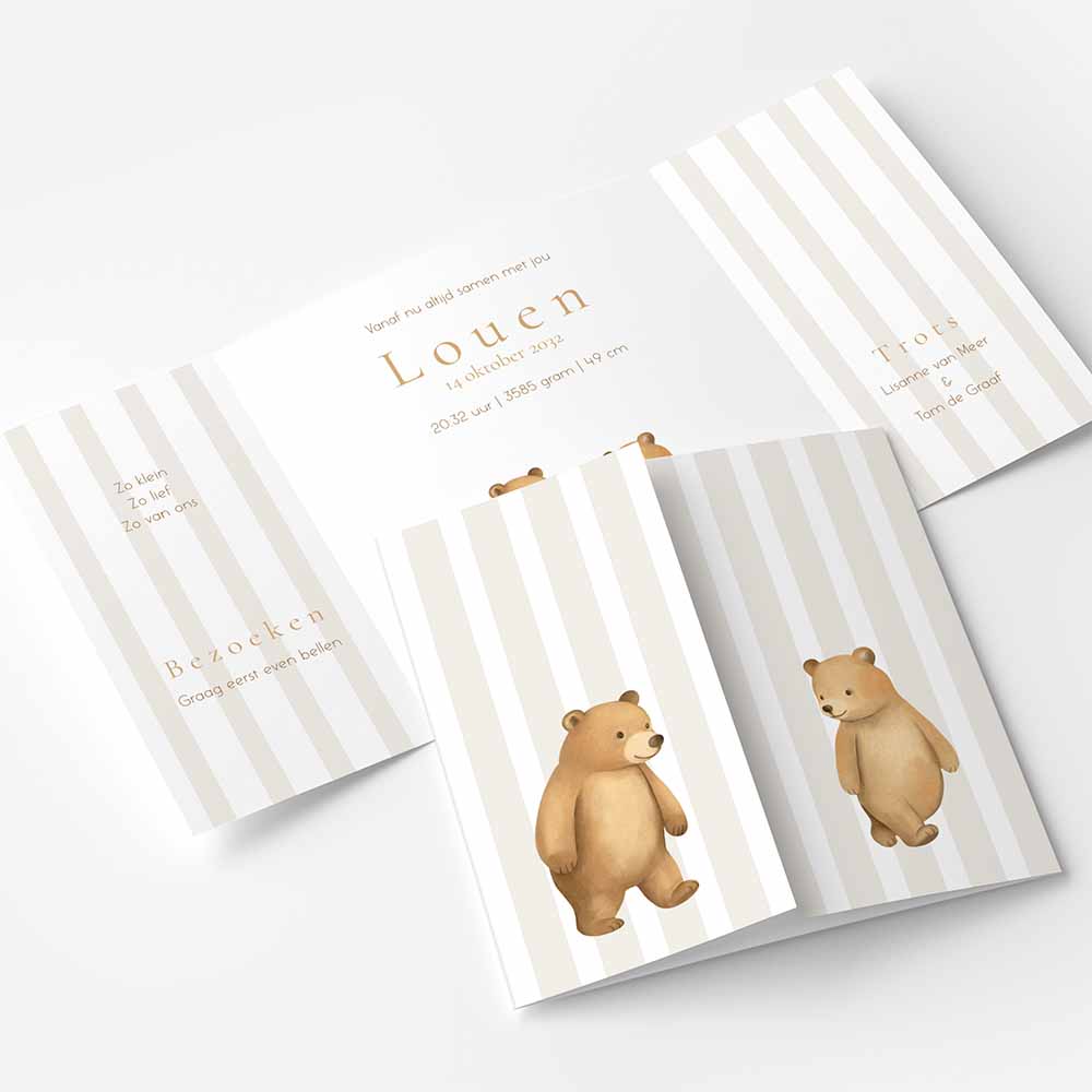 Zijn jullie op zoek naar een origineel geboortekaartje voor jullie eerste kindje. Op het kaartje in theatervorm zie je een berengezin dat hand in hand loopt. Pas het kaartje helemaal naar wens aan in onze online editor. Ben je benieuwd hoe het kaartje er in het echt uit ziet? Bestel dan een proefdruk!
