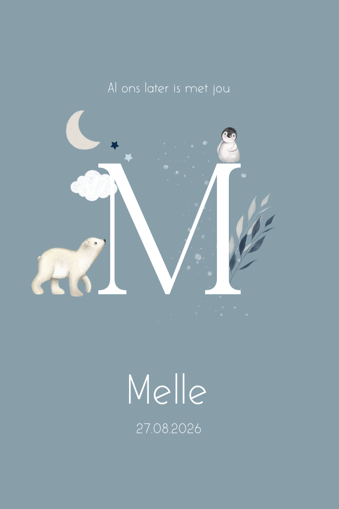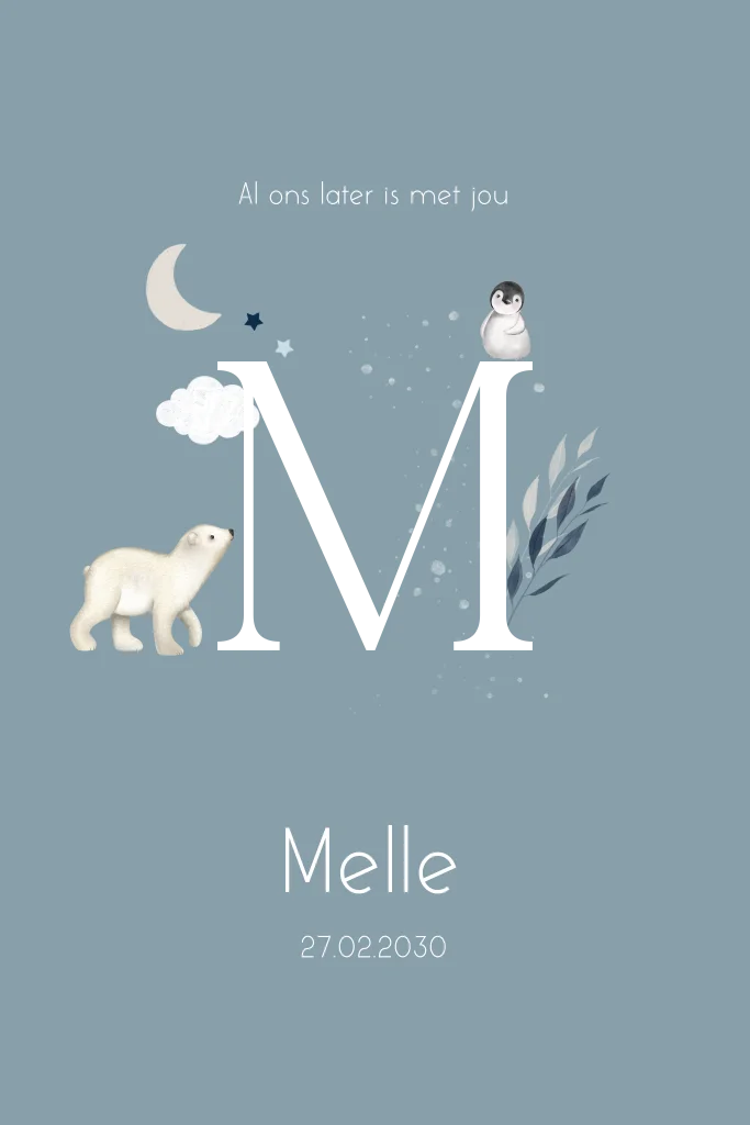 Wat een tof geboortekaartje voor jouw kindje. Dit kaartje heeft een winters thema met een grijs/blauwe achtergrondkleur. In het midden van het kaartje zie je een goudfolie initiaal. Om de letter heen zie je verschillende winterse elementen zoals een ijsbeer, pinguïn, sterretjes en takjes. Pas het kaartje naar wens aan in onze online editor.