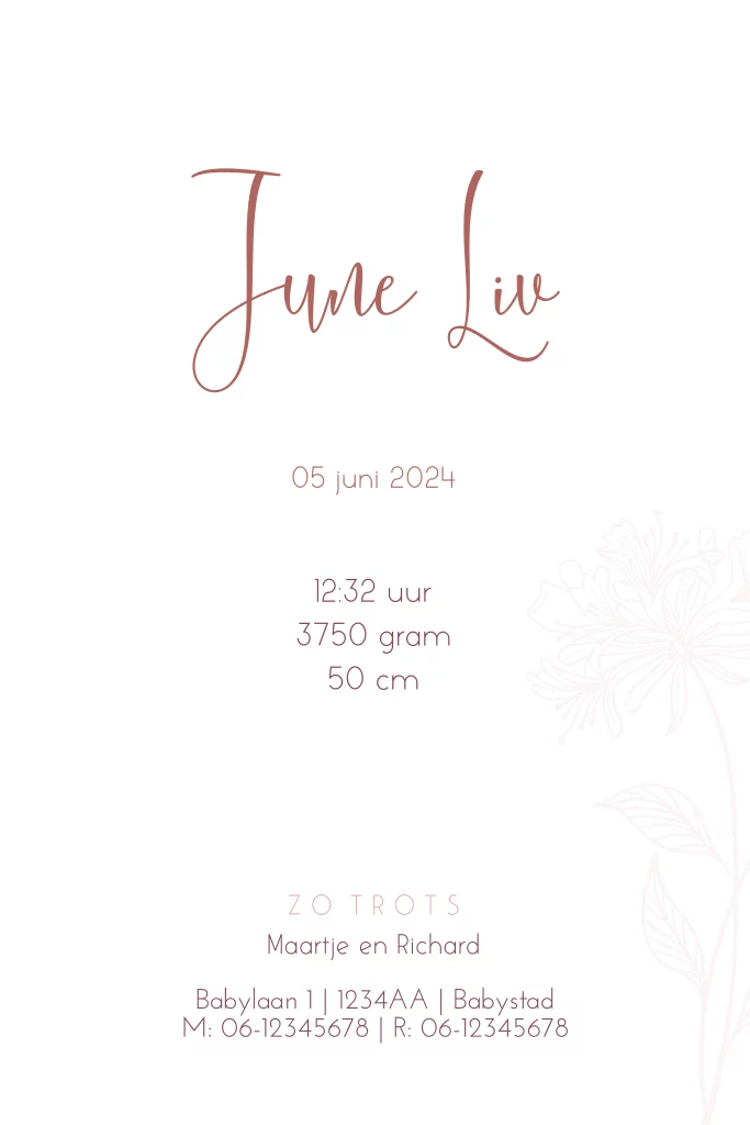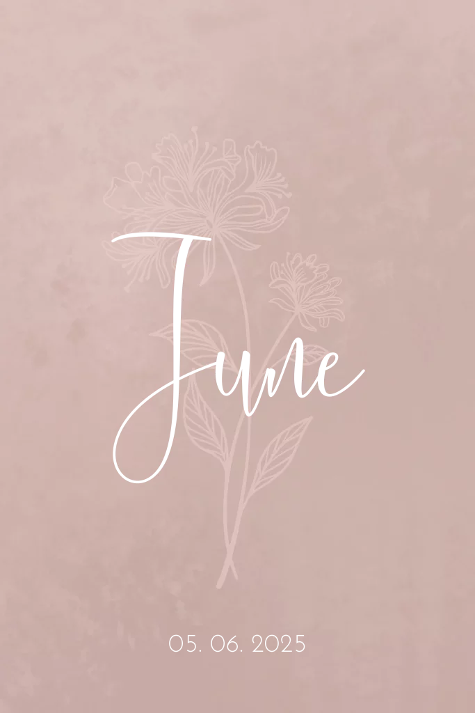 Geboortekaart met illustratie van geboortebloem maand juni, de kamperfoelie. De achtergrond van het geboortekaartje heeft een prachtige roze velvet-look. De naam en datum is gedrukt in roségoudfolie. Pas het kaartje naar wens aan in onze online editor.