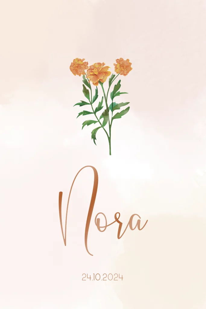 Een geboortekaartje met de geboortebloem voor de maand oktober. Het kaartje heeft een prachtige illustratie van de goudsbloem. De naam is gedrukt in hoogglans en de achtergrond heeft een prachtige watercolour.