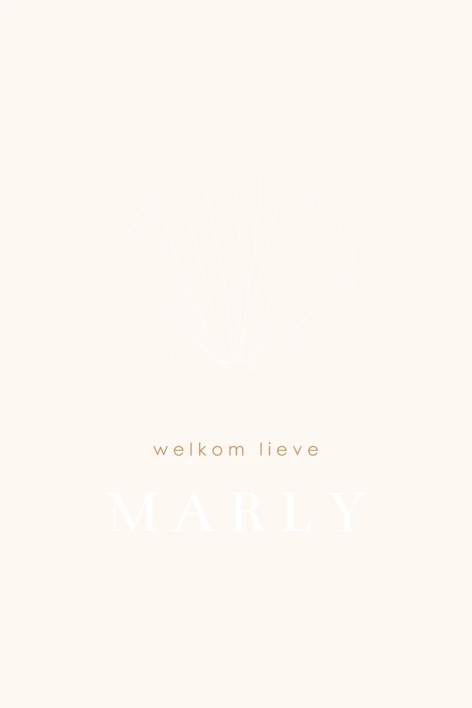 Een hip geboortekaartje voor jouw kindje. Het kaartje heeft een gebroken witte achtergrond met daarop een lijntekening van een schelp. De lijntekening wordt gedrukt in goudfolie.