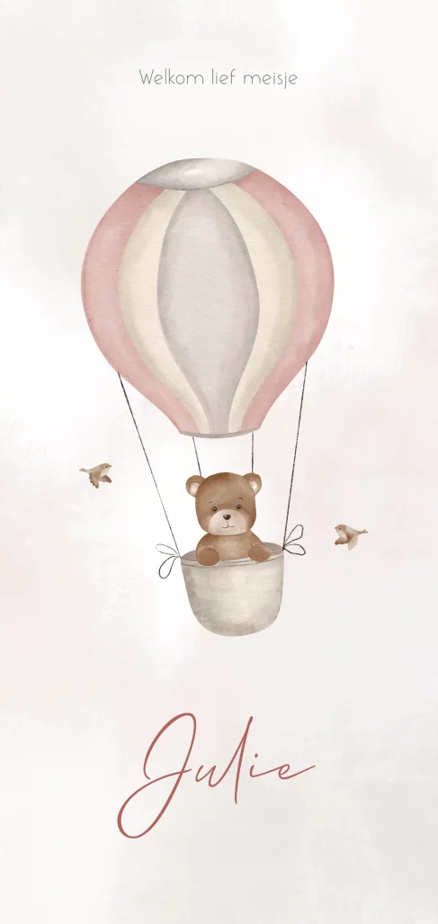 Een romantisch geboortekaartje voor jouw kindje. Het kaartje heeft een dromerige zacht roze watercolour achtergrond. Hierop zie je een lieve illustratie van een beertje in een luchtballon. Naast de luchtballon vliegen twee vogeltjes mee.