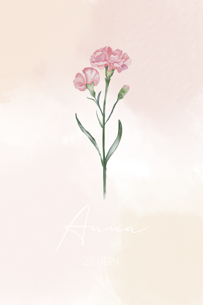 Schattig geboortekaartje met handgetekende aquarel geboortebloem van de maand januari. Deze maand heeft als geboortebloem de anjer. Op dit kaartje zie je een lieve roze anjer op een watercolour achtergrond. De naam is gedrukt in roségoudfolie.