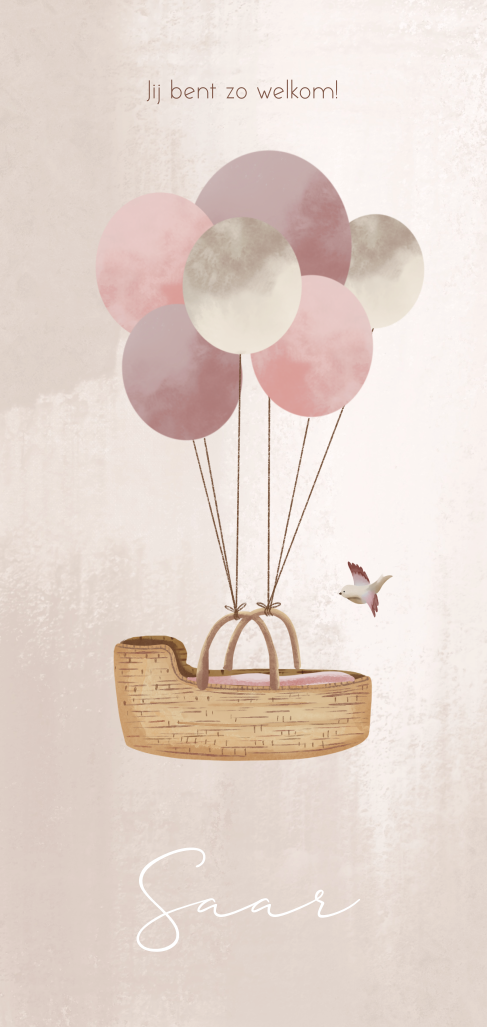 Een romantisch en lief geboortekaartjes voor jullie dochter. Op het kaartje zie je een lieve illustratie van een rieten mandje met daaraan meerdere ballonnen. De naam is in roségoudfolie gedrukt. Personaliseer dit kaartje voor jullie kleintje in onze online editor.