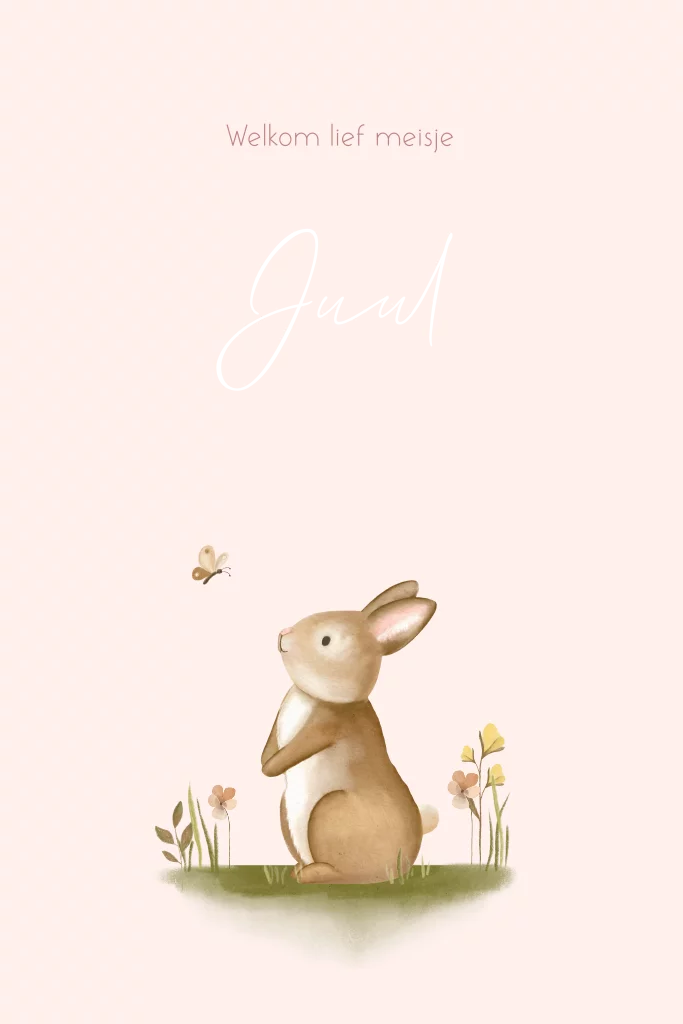 Een schattig roze rondhoek geboortekaartje. Dit goudfolie geboortekaartje voor een meisje heeft een schattige illustratie van een konijntje. Het konijntje wordt vergezel door een vlindertje. De naam is gedrukt in goudfolie.