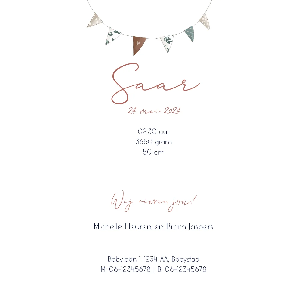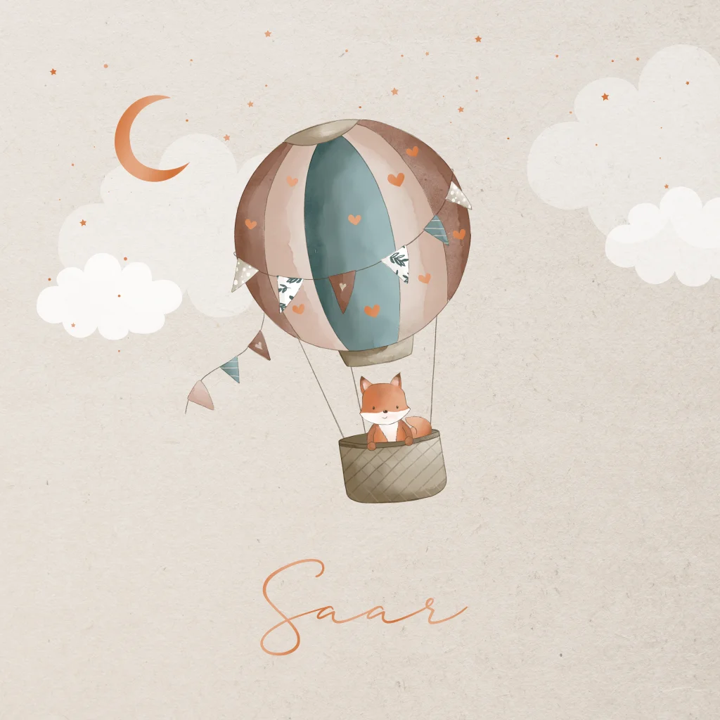 Een schttige illustratie van een vosje in een luchtballon. Het kaartje heeft een zacht beige achtergrond met een lichte structuur. Aan de luchtballon hangen feestelijke slingers. De naam is gedrukt in hoogglans. In onze online editor kan je kiezen uit verschillende lettertypes, kleuren en afbeeldingen om dit geboortekaartje te personaliseren.Dit product maakt onderdeel uit van deze set.