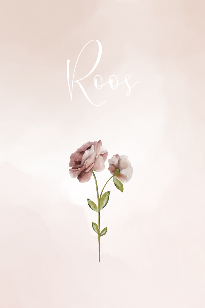 Schattig geboortekaartje met handgetekende aquarel geboortebloem maand juni, de roos. De bloem heeft een zacht roze achtergrond met een lichte structuur. De naam is gedrukt in roségoudfolie.