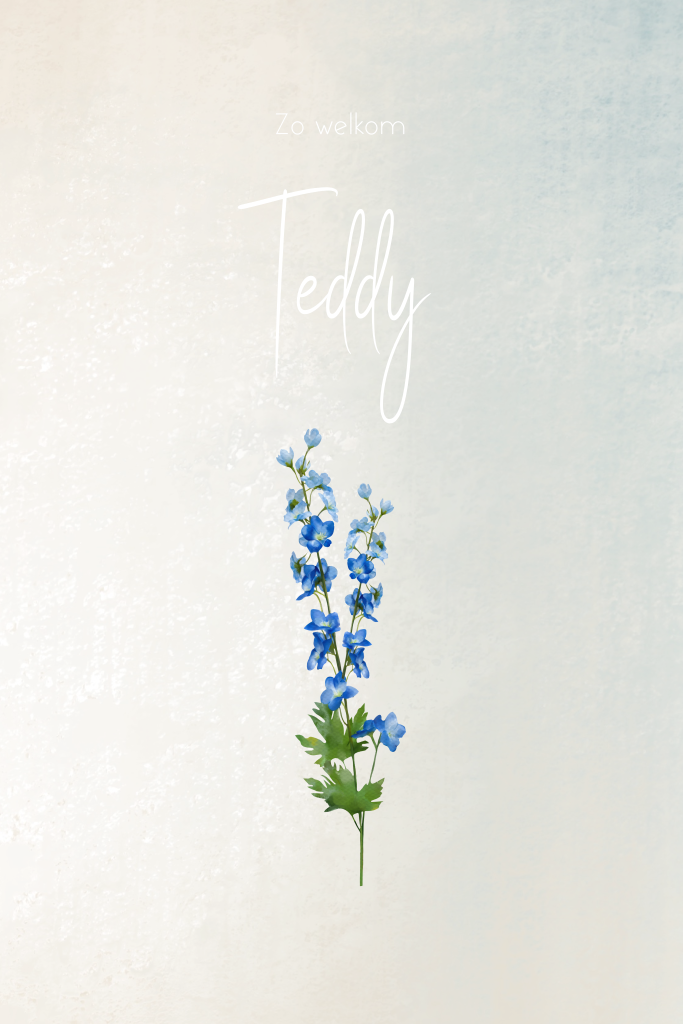 Stijlvol geboortebloem geboortekaartje met ridderspoor