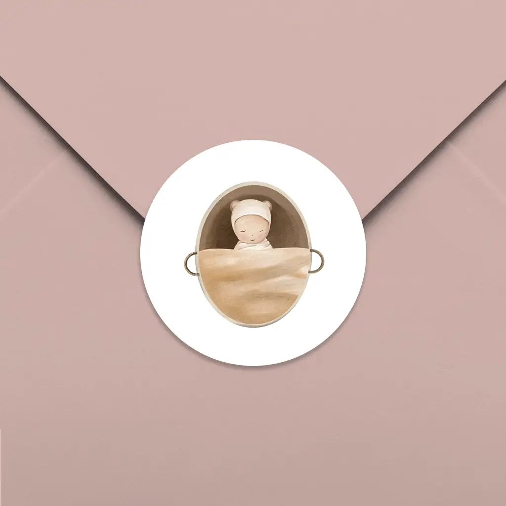 Een lieve sluitsticker voor op de envelop. De sticker heeft een witte achtergrond met daarop een lieve illustratie van een baby in een mandje. Pas het ontwerp naar wens aan in de online editor.