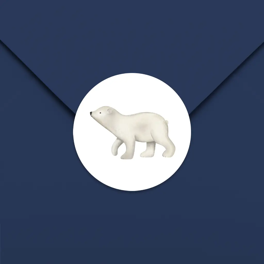 Een schattige sluitsticker met en baby ijsbeer op een witte achtergrond. Pas de kleur van de achtergrond gemakkelijk aan in onze editor en laat de sticker aansluiten op je geboortekaartje van Studio Poppybird. De sluitstickers hebben een diameter van 35 mm en worden geleverd op vellen van 25 stuks.
