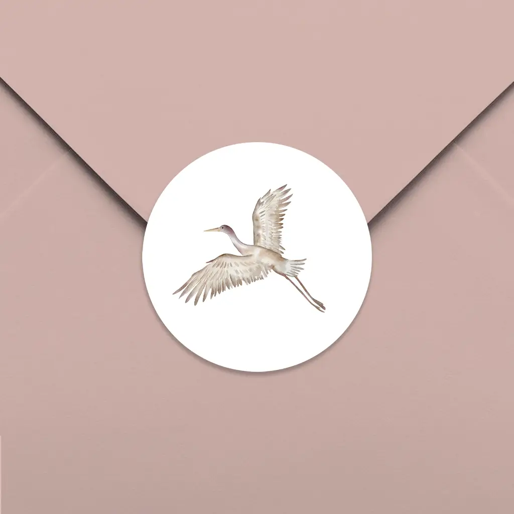 Sluitsticker met een prachtige kraanvogel. De kraanvogel staat op een witte achtergrond en is gekleurd in aardetinten. De sluitsticker past helemaal bij het originele geboortekaartje van studio Poppybird.