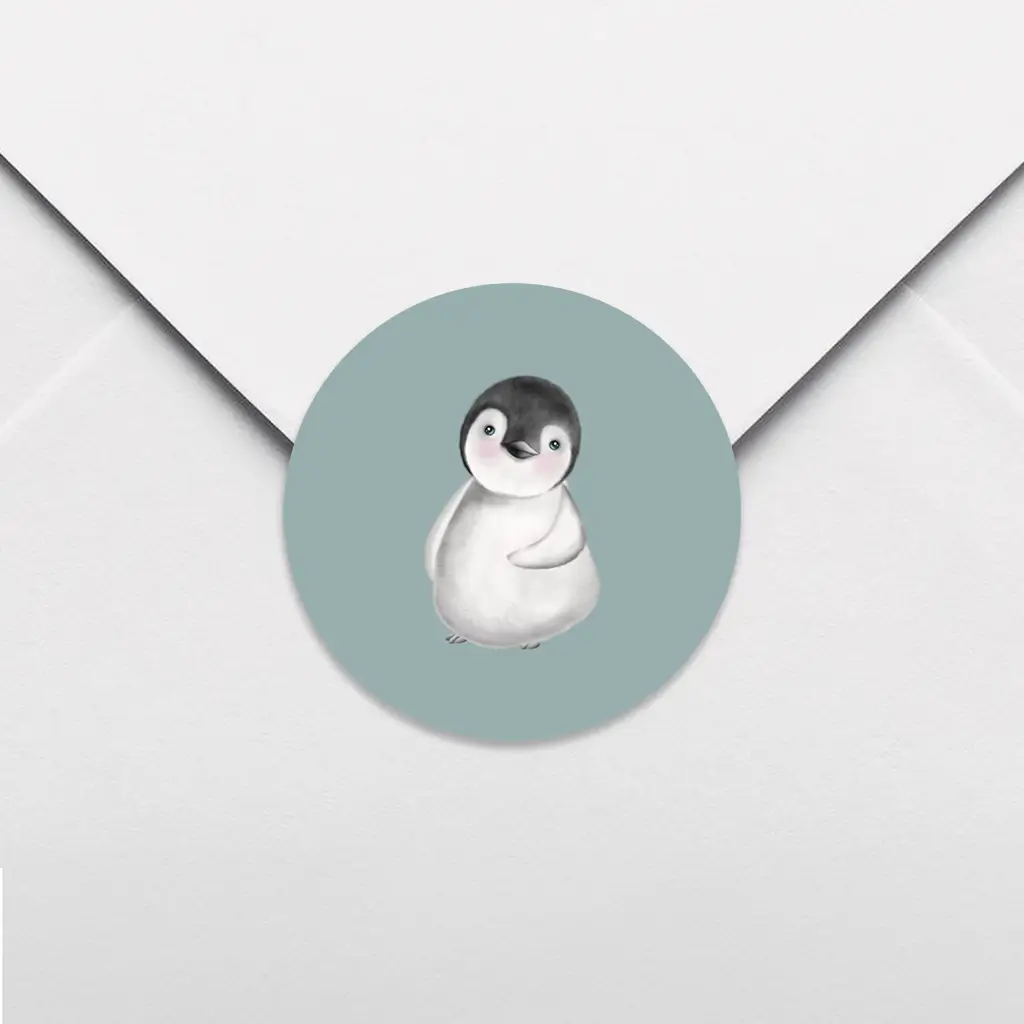 Een schattige sluitsticker met een baby pinguïn op een grijsblauwe achtergond. De kleur van de achtergrond kan je naar eigen wensen aanpassen in de editor.