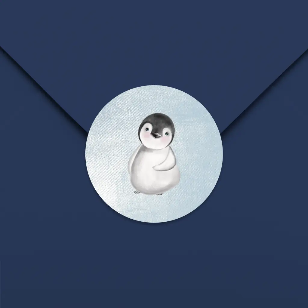 Een schattige sluitsticker met een pinguïn op een blauwe achtergrond. Op de sluitsticker staat een lieve baby pinguïn die naar je kijkt. De kleuren van de sluitsticker kan je naar je eigen wensen aanpassen in de editor. De sluitstickers hebben een diameter van 35 mm en worden geleverd op vellen van 25 stuks.
